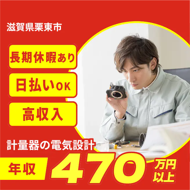◆日払い・仮払いOK(アプリでカンタン申請!) 交通費 支給あり 応募の流れ 本ページ内<応募する>ボタンより、必要項目をご入力の上、ご応募ください。 勤務地 【勤務地】滋賀県栗東市出庭 勤務時間 【勤務地】8:30~17:15(休憩45分)