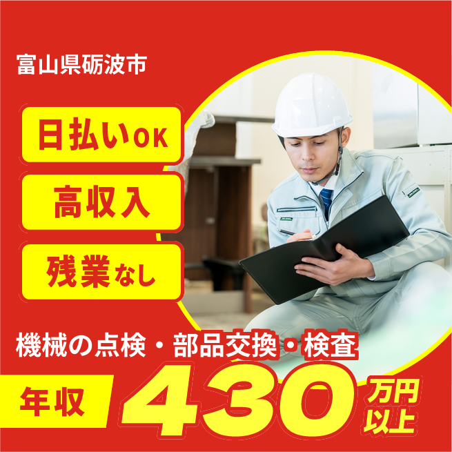 給与詳細 年収例 4,320,000円 月収例 360,000円 勤務地 富山県砺波市 仕事内容 【機械の点検・部品交換・チェック】