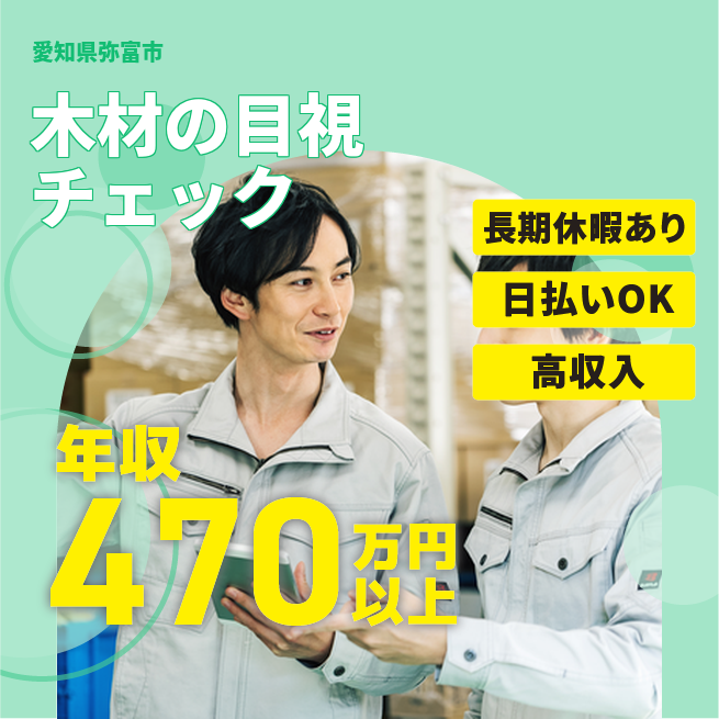・受動喫煙対策あり、詳細は面接時にお伝えします。 公開日 2025年10月01日 【木材製品の目視チェック・出荷準備】