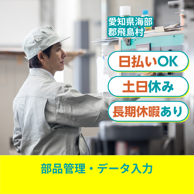 給与詳細 月収例 240,000円 日給例 10,400円 勤務地 愛知県海部郡飛島村 仕事内容 【部品管理・データ入力】