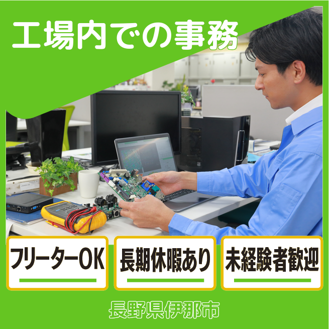 給与詳細 月収例 210,000円 時給例 1,200円 勤務地 長野県伊那市 仕事内容 【工場内での事務作業】