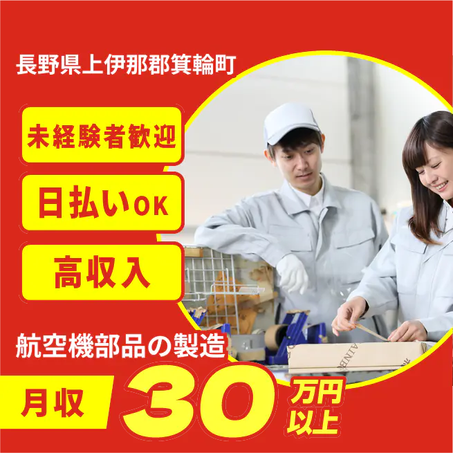 ◆日払い・仮払いOK(アプリでカンタン申請!) 交通費 支給あり 応募の流れ 本ページ内<応募する>ボタンより、必要項目をご入力の上、ご応募ください。 勤務地 【勤務地】長野県上伊那郡箕輪町中箕輪 勤務時間 【勤務地】8:00~17:00(休憩60分)
