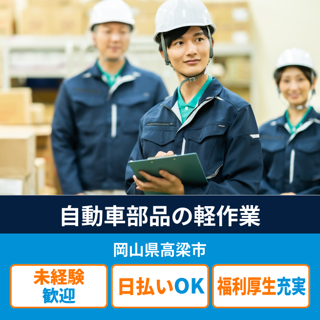 給与詳細 月収例 250,000円 日給例 10,800円 勤務地 岡山県高梁市 仕事内容 【業務内容】自動車部品製造工場での軽作業を担当します。