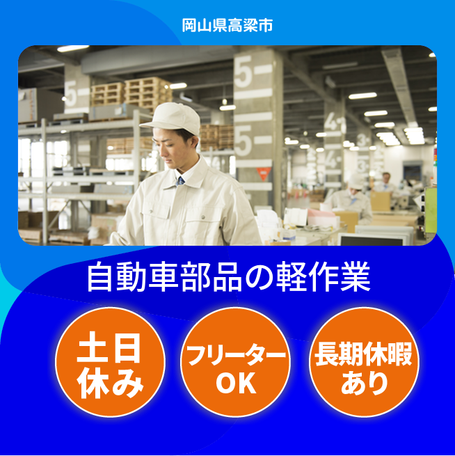 給与詳細 月収例 250,000円 日給例 10,800円 勤務地 岡山県高梁市 仕事内容 【業務内容】自動車部品製造工場での軽作業を担当します。
