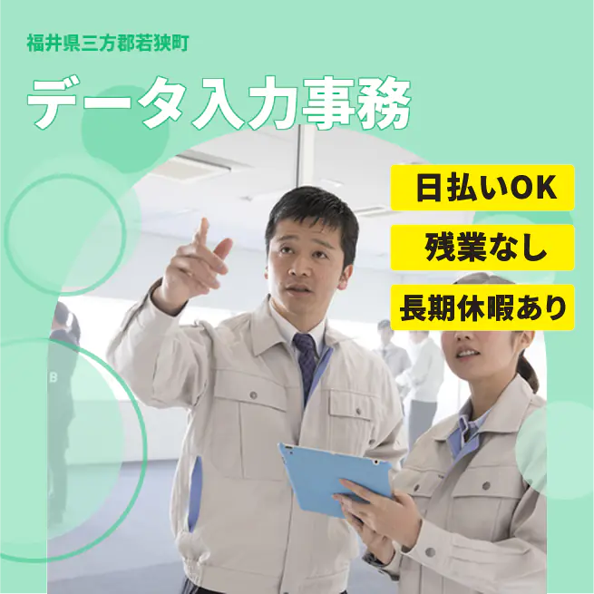 給与詳細 月収例 180,000円 時給例 1,150円 勤務地 福井県三方郡若狭町 仕事内容 【業務内容】