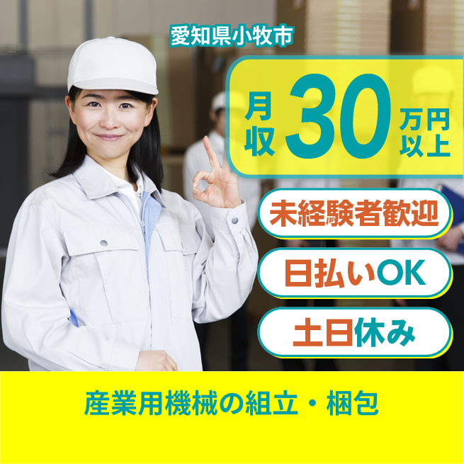 給与詳細 月収例 300,000円 日給例 10,800円 勤務地 愛知県小牧市 仕事内容 【産業用機械の組立・梱包】