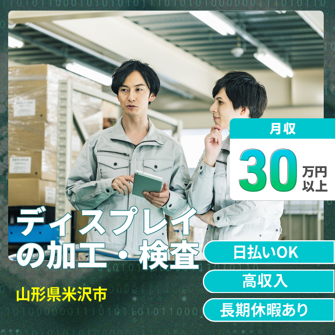 給与詳細 月収例 310,000円 時給例 1,600円 勤務地 山形県米沢市 仕事内容 【車載用ディスプレイの加工・検査】
