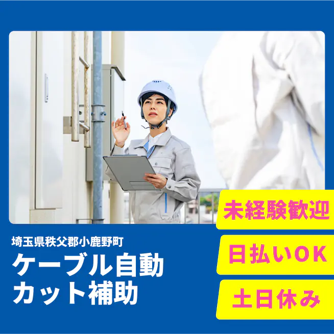 ◆日払い・仮払いOK(アプリでカンタン申請!) 交通費 支給あり 応募の流れ 本ページ内<応募する>ボタンより、必要項目をご入力の上、ご応募ください。 勤務地 【勤務地】埼玉県秩父郡小鹿野町下小鹿野 勤務時間 【勤務地】6:00~15:00(休憩60分)