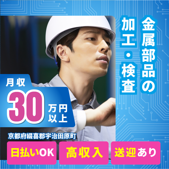給与詳細 月収例 310,000円 日給例 12,400円 勤務地 京都府綴喜郡宇治田原町 仕事内容 【金属部品の加工・検査】