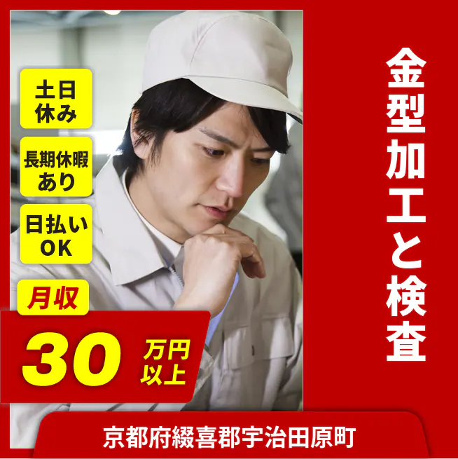 ◆日払い・仮払いOK(アプリでカンタン申請!) 交通費 支給あり 応募の流れ 本ページ内<応募する>ボタンより、必要項目をご入力の上、ご応募ください。 勤務地 【勤務地】京都府綴喜郡宇治田原町立川 勤務時間 【勤務地】8:30~17:30(休憩60分)
