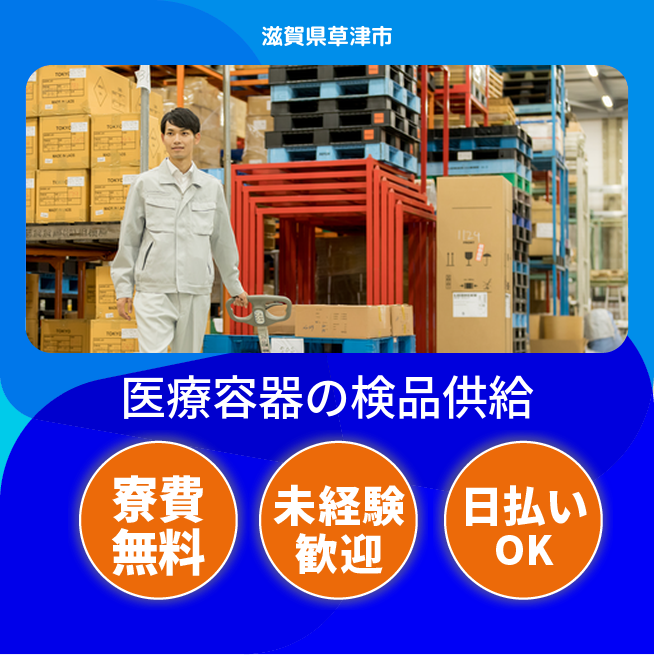 給与詳細 月収例 240,000円 日給例 10,400円 勤務地 滋賀県草津市 仕事内容 【容器やゴム栓の検品・資材の供給】