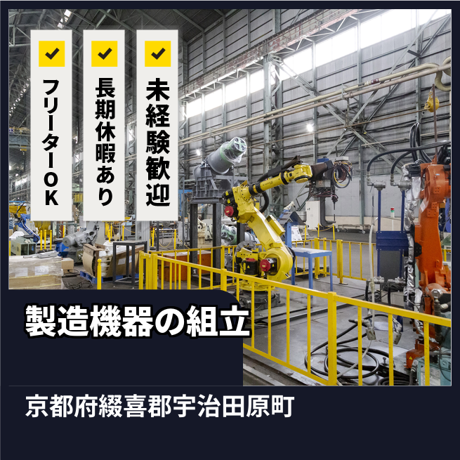 給与詳細 月収例 260,000円 日給例 10,800円 勤務地 京都府綴喜郡宇治田原町 仕事内容 【大手工場で使われる製造機器の組立】