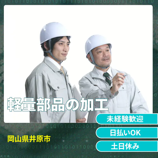 ◆日払い・仮払いOK(アプリでカンタン申請!) 交通費 支給あり 応募の流れ 本ページ内<応募する>ボタンより、必要項目をご入力の上、ご応募ください。 勤務地 【勤務地】岡山県井原市西江原町 勤務時間 【勤務地】<日勤>