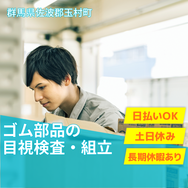 給与詳細 月収例 250,000円 時給例 1,220円 勤務地 群馬県佐波郡玉村町 仕事内容 【ゴム部品の目視検査・組立】