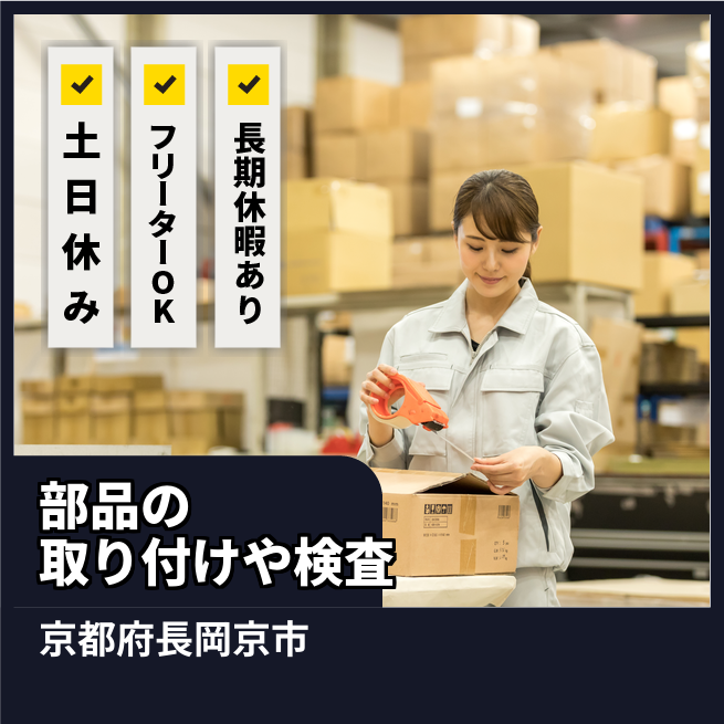 給与詳細 月収例 230,000円 日給例 11,200円 勤務地 京都府長岡京市 仕事内容 【部品の取り付けや検査】