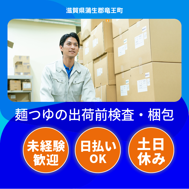 給与詳細 月収例 260,000円 日給例 11,200円 勤務地 滋賀県蒲生郡竜王町 仕事内容 【麺つゆの出荷前検査・梱包】