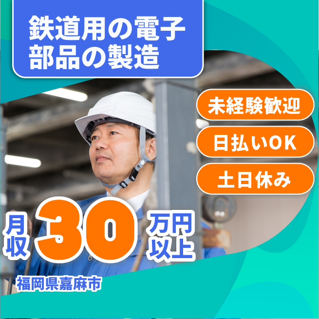 給与詳細 月収例 300,000円 日給例 11,200円 勤務地 福岡県嘉麻市 仕事内容 【鉄道用の電子部品の製造】