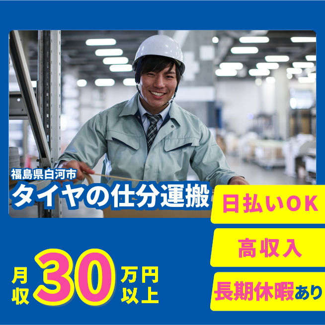 給与詳細 月収例 320,000円 時給例 1,750円 勤務地 福島県白河市 仕事内容 【ハンドリフトでタイヤの運搬・仕分け】