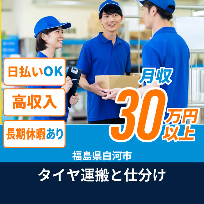 給与詳細 月収例 320,000円 時給例 1,750円 勤務地 福島県白河市 仕事内容 【業務内容】タイヤの運搬と仕分けを行う倉庫内作業