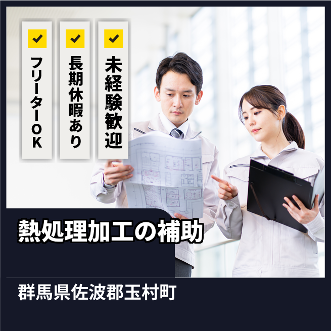 給与詳細 月収例 200,000円 時給例 1,230円 勤務地 群馬県佐波郡玉村町 仕事内容 【熱処理加工の補助作業】