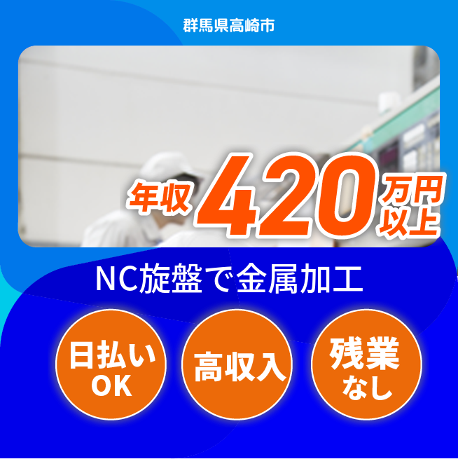 給与詳細 年収例 4,200,000円 月収例 350,000円 勤務地 群馬県高崎市 仕事内容 【NC旋盤・マシニングセンタで金属加工】