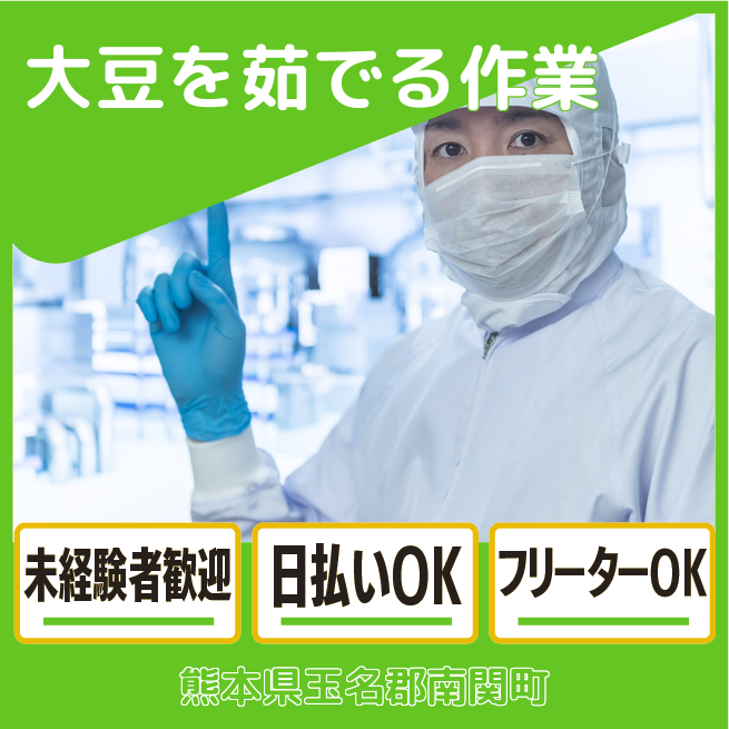給与詳細 月収例 240,000円 時給例 1,150円 勤務地 熊本県玉名郡南関町 仕事内容 【大豆を茹でる作業】