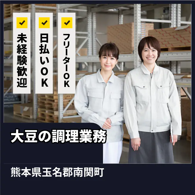◆日払い・仮払いOK(アプリでカンタン申請!) 交通費 支給あり 応募の流れ 本ページ内<応募する>ボタンより、必要項目をご入力の上、ご応募ください。 勤務地 【勤務地】熊本県玉名郡南関町- 勤務時間 【勤務地】8:00~17:00(休憩60分)