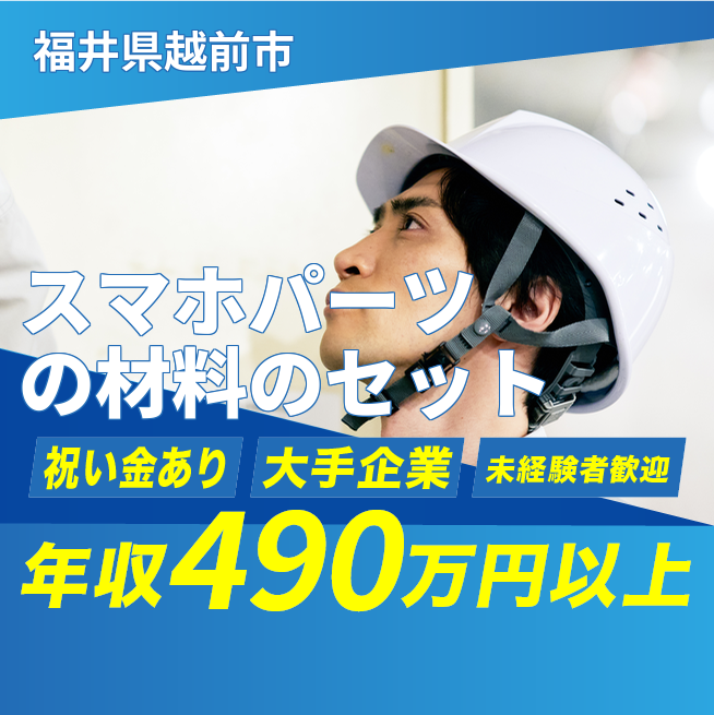 給与詳細 年収例 4,920,000円 月収例 410,000円 勤務地 福井県越前市 仕事内容 【スマホパーツの材料のセット・機械補助】