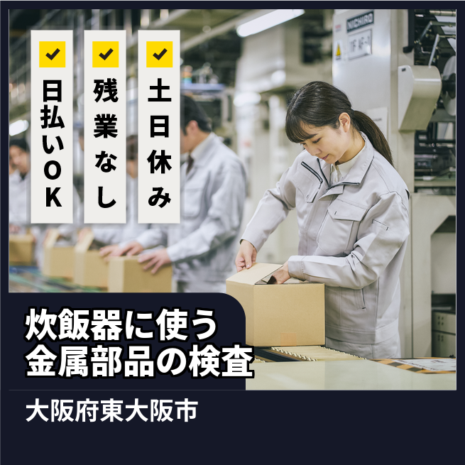 給与詳細 月収例 240,000円 日給例 11,840円 勤務地 大阪府東大阪市 仕事内容 【炊飯器に使う金属部品の検査】