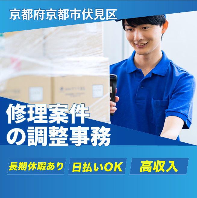 給与詳細 月収例 250,000円 日給例 11,200円 勤務地 京都府京都市伏見区 仕事内容 【修理案件の日程・人員調整】