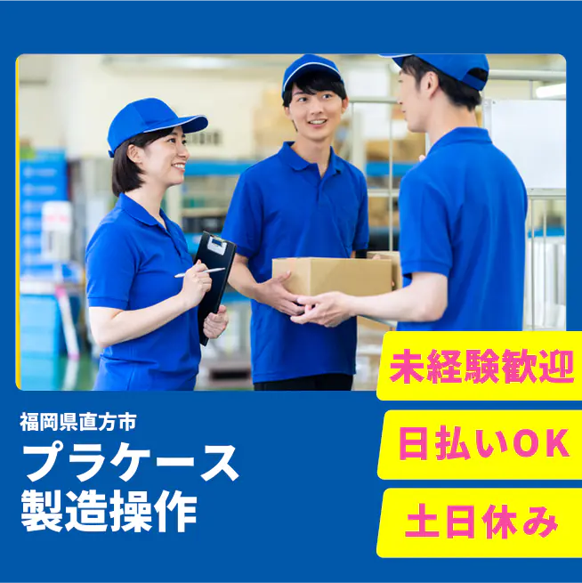 ◆日払い・仮払いOK(アプリでカンタン申請!) 交通費 支給あり 応募の流れ 本ページ内<応募する>ボタンより、必要項目をご入力の上、ご応募ください。 勤務地 【勤務地】福岡県直方市頓野 勤務時間 【勤務地】8:00~17:15(休憩45分+小休憩15分×2回)