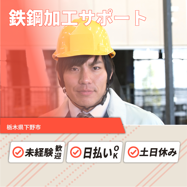 ※規定あり 交通費 支給あり 応募の流れ 本ページ内<応募する>ボタンより、必要項目をご入力の上、ご応募ください。 勤務地 【勤務地】栃木県下野市下坪山 勤務時間 【勤務地】8:00~17:00(休憩60分)