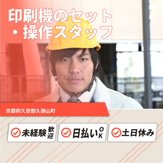 ◆日払い・仮払いOK(アプリでカンタン申請!) 交通費 支給あり 応募の流れ 本ページ内<応募する>ボタンより、必要項目をご入力の上、ご応募ください。 勤務地 【勤務地】京都府久世郡久御山町島田 勤務時間 【勤務地】8:45~17:45(休憩60分)