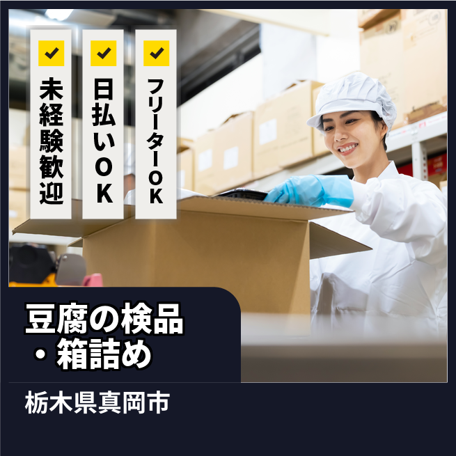 就業場所:全国/就業範囲:派遣先業務全般(詳細は就業条件明示書で明示する) 【豆腐の検品・箱詰め】
