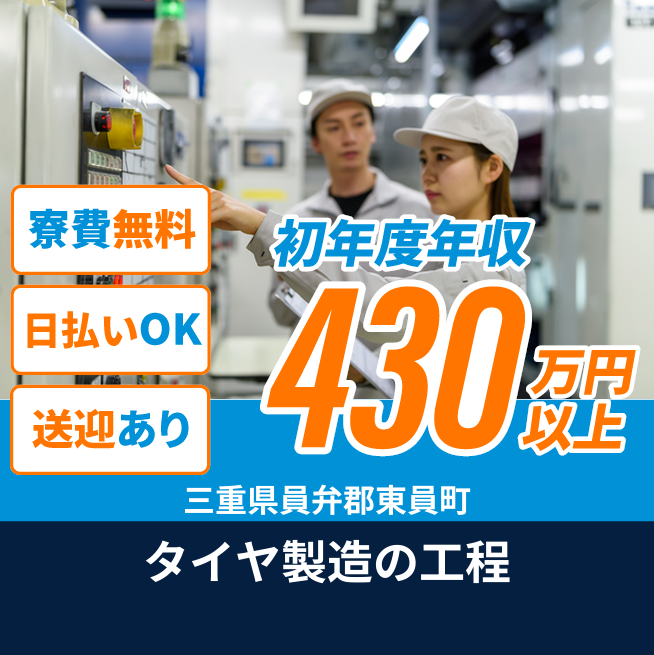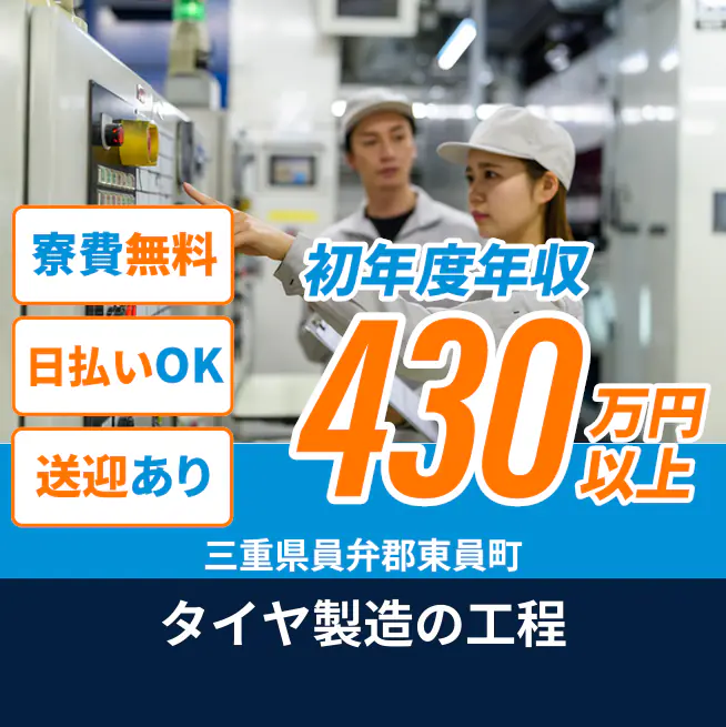 給与詳細 年収例 4,320,000円 月収例 360,000円 勤務地 三重県員弁郡東員町 仕事内容 【業務内容】 ゴム製品の加工・検査を担当し、自動車部品やタイヤを製造する大手メーカーの工場で働く仕事です。