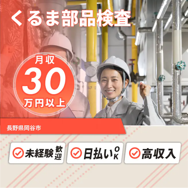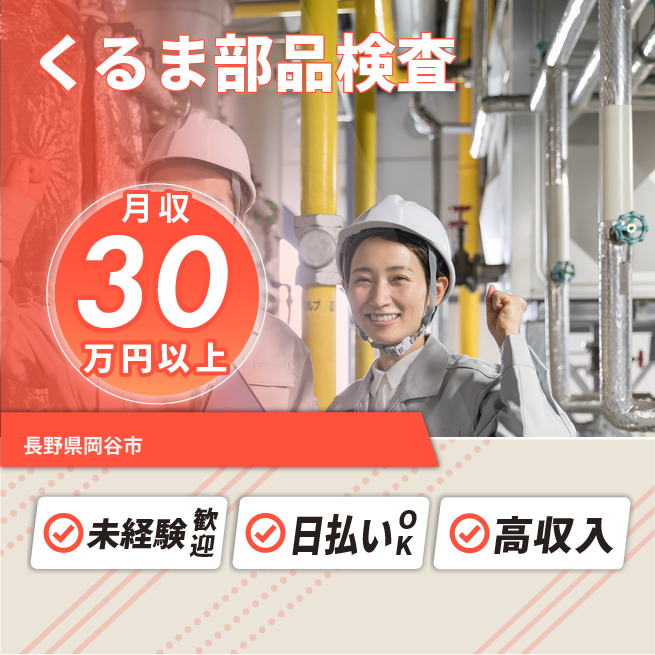 ※月収内訳/時給1460円×8時間30分×20日+残業手当 交通費 支給あり 応募の流れ 本ページ内<応募する>ボタンより、必要項目をご入力の上、ご応募ください。 勤務地 【勤務地】長野県岡谷市- 勤務時間 【勤務地】8:00~17:35 必須資格 経験不問 福利厚生 ★通勤交通費支給