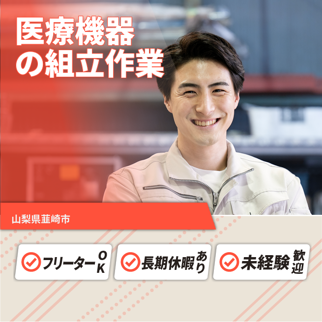 ※月収内訳/時給1260円×7時間55分×20日 交通費 支給あり 応募の流れ 本ページ内<応募する>ボタンより、必要項目をご入力の上、ご応募ください。 勤務地 【勤務地】山梨県韮崎市- 勤務時間 【勤務地】【日勤】