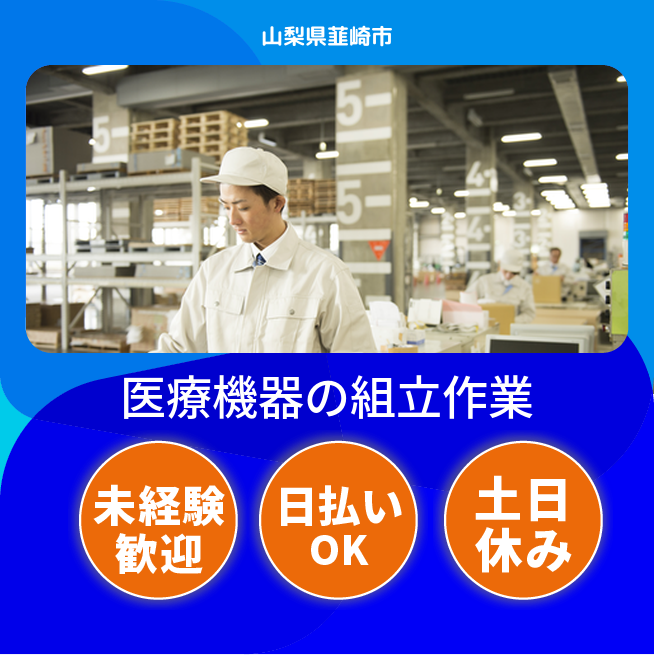 ※月収内訳/時給1260円×7時間55分×20日 交通費 支給あり 応募の流れ 本ページ内<応募する>ボタンより、必要項目をご入力の上、ご応募ください。 勤務地 【勤務地】山梨県韮崎市- 勤務時間 【勤務地】【日勤】