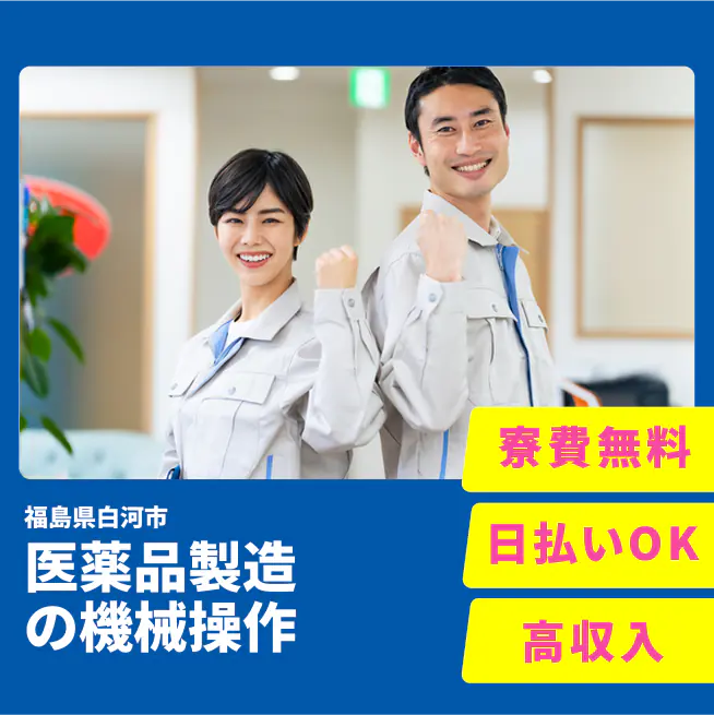 ◆日払い・仮払いOK(アプリでカンタン申請!) 交通費 支給あり 応募の流れ 本ページ内<応募する>ボタンより、必要項目をご入力の上、ご応募ください。 勤務地 【勤務地】福島県白河市白坂 勤務時間 【勤務地】<日勤>