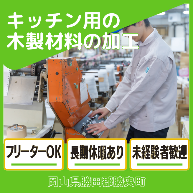 給与詳細 月収例 220,000円 日給例 10,400円 勤務地 岡山県勝田郡勝央町 仕事内容 【システムキッチン用の木製材料加工】