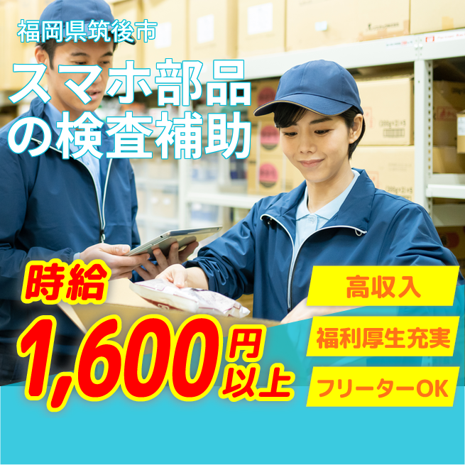 給与詳細 月収例 270,000円 時給例 1,688円 勤務地 福岡県筑後市 仕事内容 【業務内容】スマホ部品の検査補助および目視検査