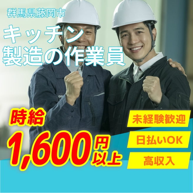 ◆日払い・仮払いOK(アプリでカンタン申請!) 交通費 支給あり 応募の流れ 本ページ内<応募する>ボタンより、必要項目をご入力の上、ご応募ください。 勤務地 【勤務地】群馬県藤岡市上大塚 勤務時間 【勤務地】<日勤>8:00~17:00(休憩60分)