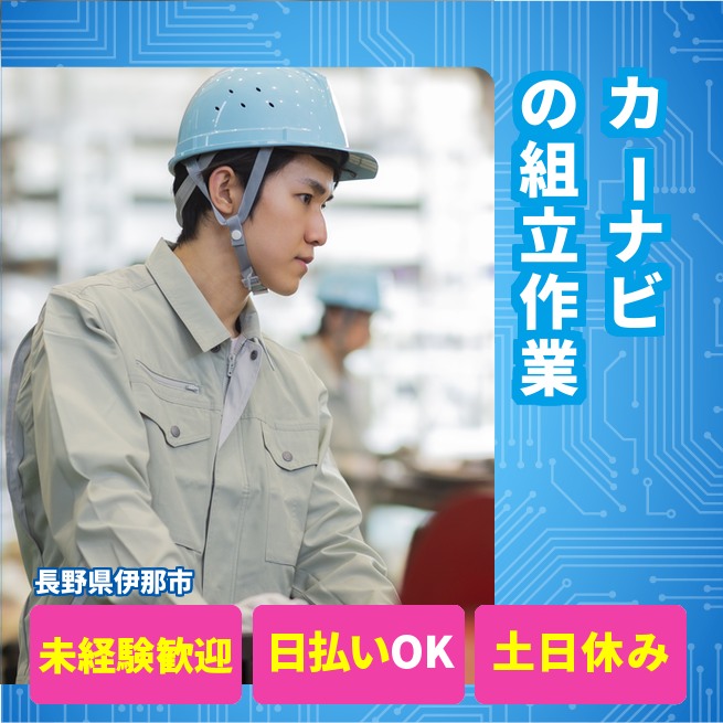 給与詳細 月収例 240,000円 日給例 10,240円 勤務地 長野県伊那市 仕事内容 【夜勤専属/時給1280円/カーナビの組立作業/女性活躍】