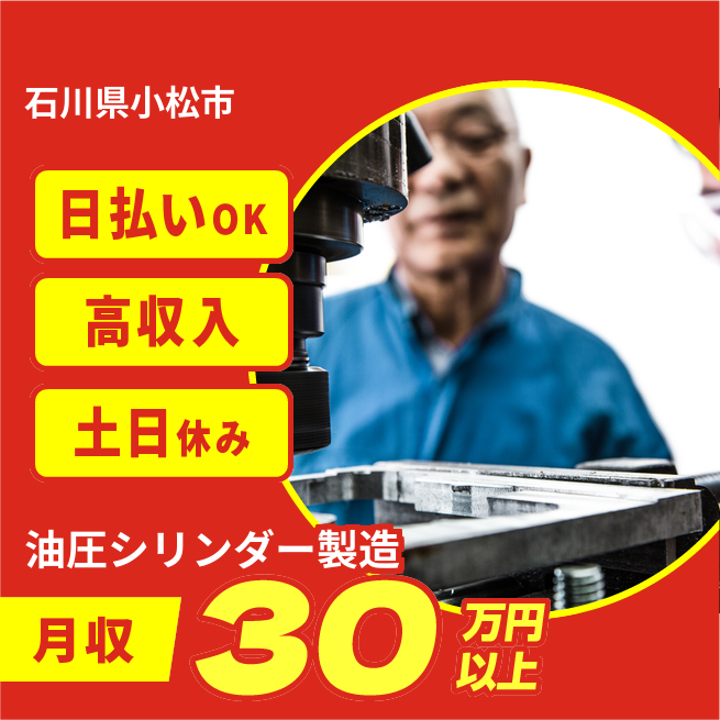 給与詳細 月収例 310,000円 日給例 12,080円 勤務地 石川県小松市 仕事内容 【業務内容】油圧シリンダーの製造工程における各種作業