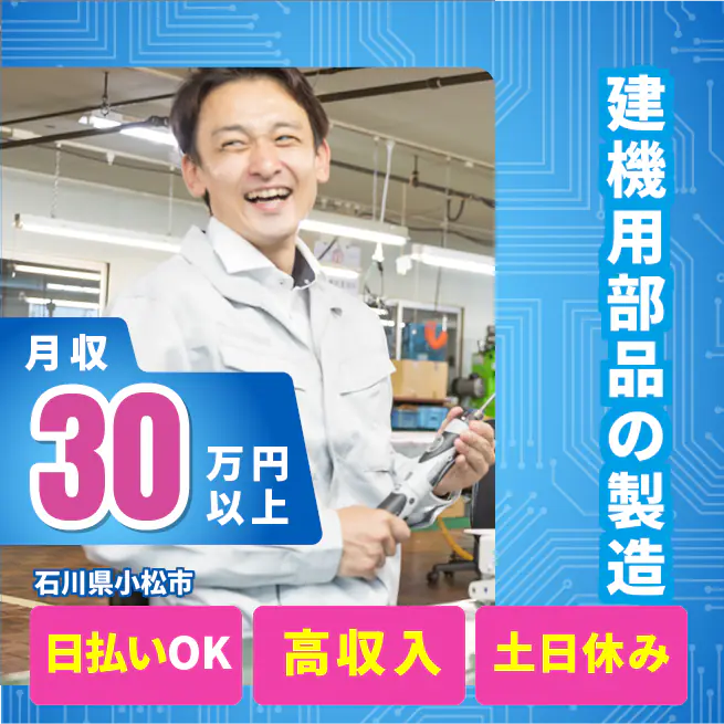 給与詳細 月収例 310,000円 日給例 12,080円 勤務地 石川県小松市 仕事内容 【業務内容】 油圧シリンダーの製造に関する各種工程を担当