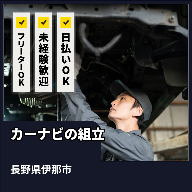給与詳細 月収例 240,000円 日給例 10,240円 勤務地 長野県伊那市 仕事内容 【夜勤専属/時給1280円/カーナビの組立作業/土日休み/女性活躍】