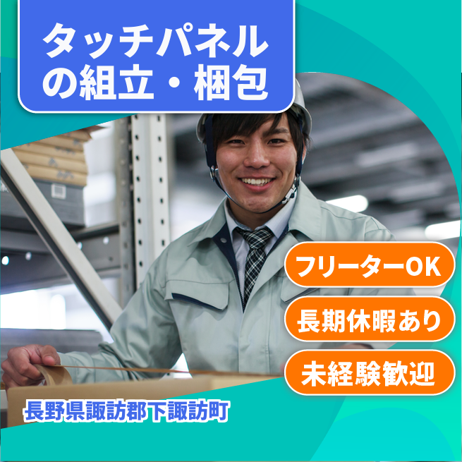 給与詳細 月収例 250,000円 時給例 1,150円 勤務地 長野県諏訪郡下諏訪町 仕事内容 【タッチパネルの組立・梱包】