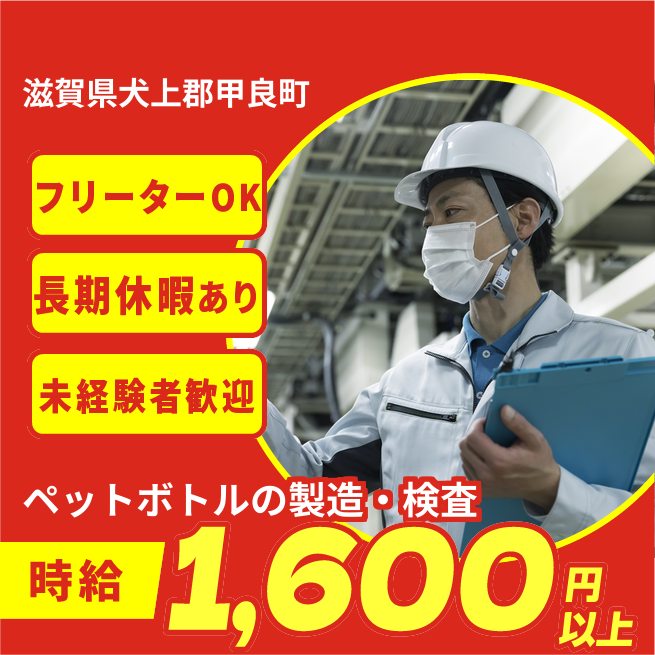 給与詳細 月収例 270,000円 時給例 1,600円 勤務地 滋賀県犬上郡甲良町 仕事内容 【ペットボトルの製造・検査】