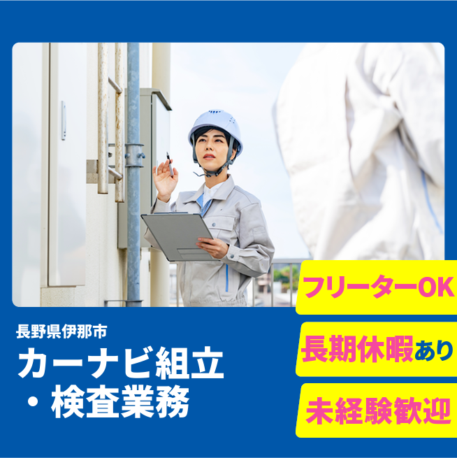 給与詳細 月収例 210,000円 日給例 10,800円 勤務地 長野県伊那市 仕事内容 【業務内容】カーナビの組立作業