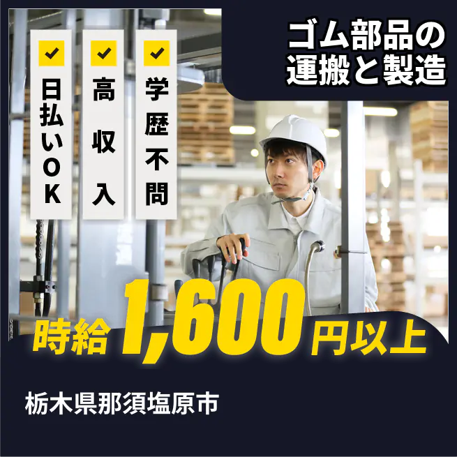 給与詳細 月収例 280,000円 時給例 1,600円 勤務地 栃木県那須塩原市 仕事内容 【業務内容】 ゴム部品の運搬と製造を担当する仕事